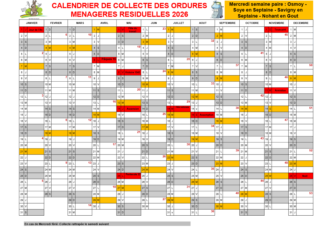 La collecte en porte à porte des ordures ménagères résiduelles se fait toutes les deux semaines depuis le mercredi 2 avril 2025 pour la commune de Soye en Septaine (voir calendrier joint)